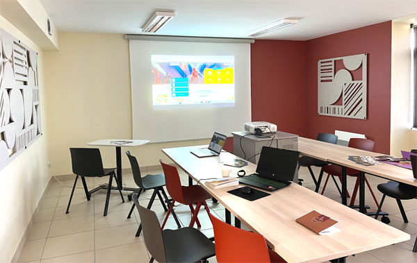 Au rez-de-chaussée une salle de réunion de 70m² est à disposition des associations. Elle est équipée de tables, chaises, vidéoprojecteur, écran et d’un espace cuisine-placards. Gratuite pour les associations, elle est à louer 50€ la journée pour les professionnels. Capacité maximum 38 personnes. Pour pousser à 80 personnes avec restauration, la salle des fêtes à proximité est également à louer.